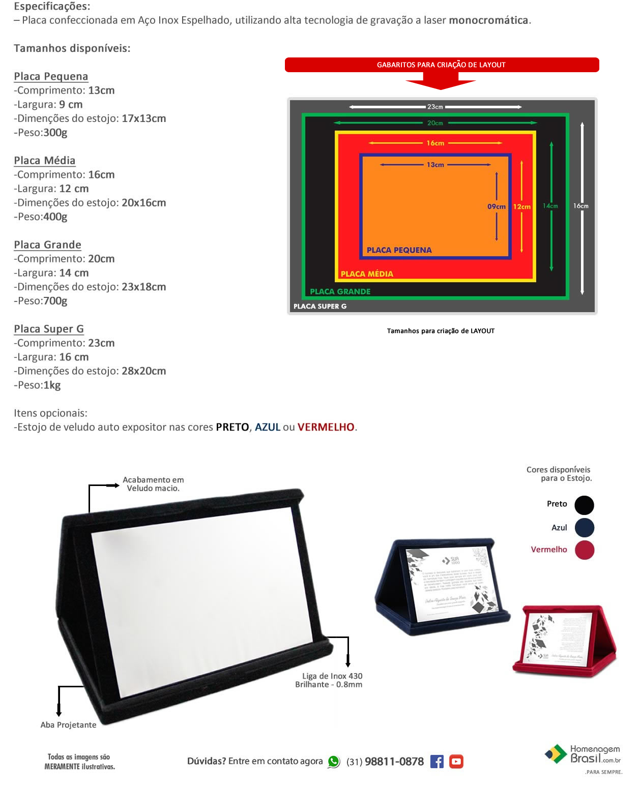 | Tamanho da Placa | Grande (20x14cm), Médio (16x12cm), Pequeno (13x9cm), Super Grande (23x16cm) |